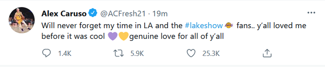 随后卡鲁索更新了社交媒体表达了对湖人队的感激,他写道:“我永远不会忘记我在洛杉矶的时光,以及所有的湖人队球迷,在我打出名堂前你们就如此爱我,我对你们所有人只有真挚的爱!”