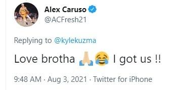 在卡鲁索和公牛队达成一致之后,卡鲁索的前湖人队友库兹马对他表示了祝贺:“我为你感到高兴,我的兄弟。下周的高尔夫时间就靠你了。”卡鲁索回复库兹马:“爱你兄弟,咱们走起。”