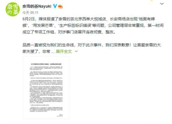 卫生问题被曝光后,奈雪的茶发布说明回应称,公司管理层非常重视,第一时间成立了专项工作组,对涉事门店展开连夜彻查、整改。
