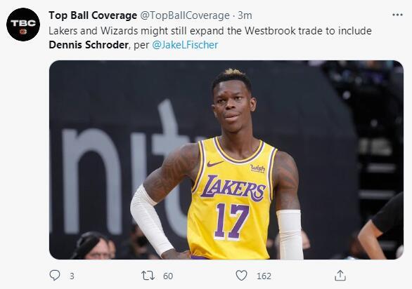 随后根据BR记者报道,湖人与奇才可能会扩大拉塞尔-威斯布鲁克的交易,这部分交易中包含了丹尼斯-施罗德的先签后换。此前曝出湖人并没有放弃在交易中得到巴迪-希尔德,难道说小黑是交易筹码之一?