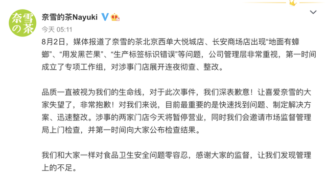 8月3日凌晨,微博@奈雪的茶Nayuki 就“新华社记者卧底奈雪的茶打工”曝光食品卫生问题,发布情况说明称:8月2日,媒体报道了奈雪的茶北京西单大悦城店、长安商场店出现“地面有蟑螂”、“用发黑芒果”、“生产标签标识错误”等问题,公司管理层非常重视,第一时间成立了专项工作组,对涉事门店展开连夜彻查、整改。