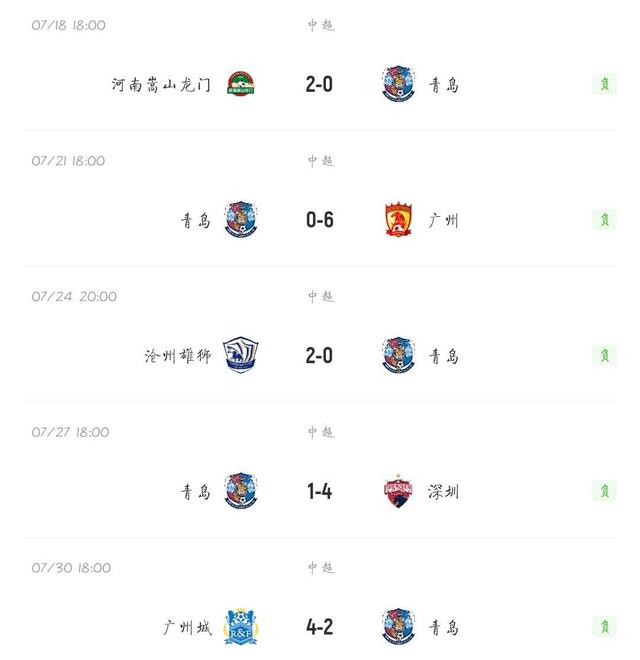 青岛队上轮联赛2-4不敌广州城,间歇期后遭遇五连败,状态十分低迷。联赛10轮过后2胜1平7负积7分,排名跌至广州赛区倒数第1,总积分榜多赛一场暂列第13。