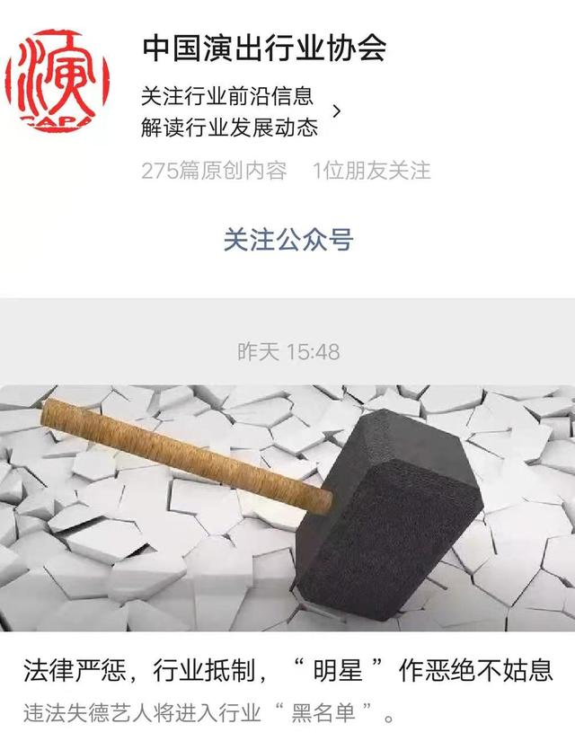 中国演出行业协会2021年8月2号下午15:48就吴亦凡事件发布消息: