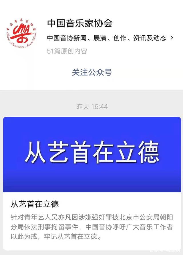 中国音乐家协会2021年8月2号下午16:44就吴亦凡事件发布消息: