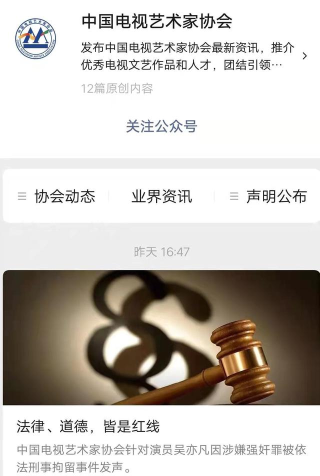 中国电视艺术家协会2021年8月2号下午16:47就吴亦凡事件发布消息: