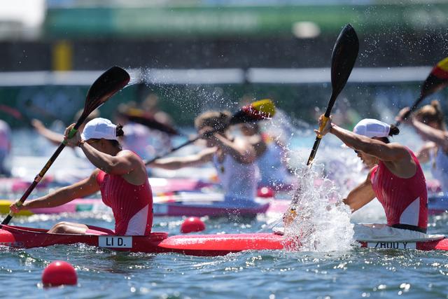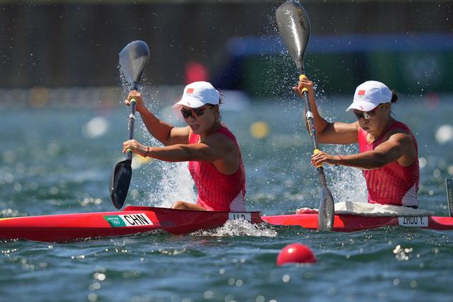 8月3日,中国选手李冬崟(左)、周玉在女子500米双人皮艇半决赛中。新华社记者 费茂华 摄