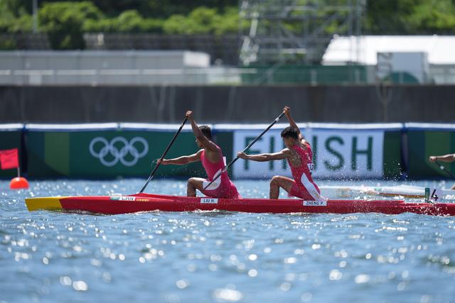 8月3日,中国选手刘浩(左)、郑鹏飞在男子1000米双人划艇半决赛中。新华社记者 费茂华 摄