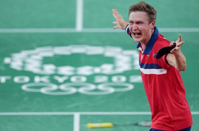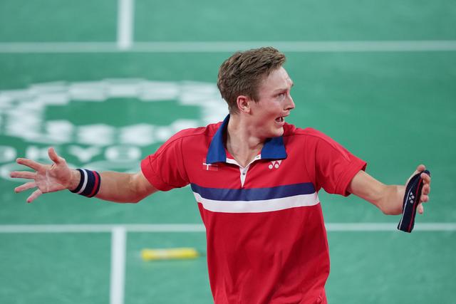 新华社照片,东京,2021年8月2日 (东京奥运会)(1)羽毛球——男单决赛:安塞龙夺冠 8月2日,安塞龙庆祝胜利。 当日,在东京奥运会羽毛球男子单打决赛中,丹麦选手安塞龙战胜中国选手谌龙,夺得冠军。 新华社记者 薛玉斌 摄
