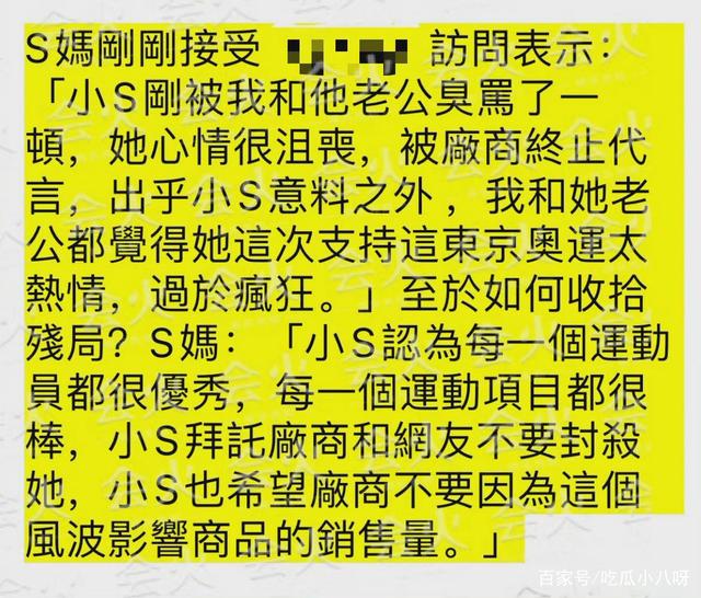 之后,小S向媒体回应今日因ins发言不当引发的质疑风波:先让我静一静好吗? 也完全没有表明立场,8月2日,小S的妈妈接受了采访,称自己与小S的丈夫已将其臭骂一顿。在小S妈妈接受采访也转达了小S的想法说:“每一个运动员都很优秀,每一个运动项目都很棒”。 小S也请求拜托厂商和广大网友不要封杀她,也希望厂家不要因为这件事影响到商品的销量。