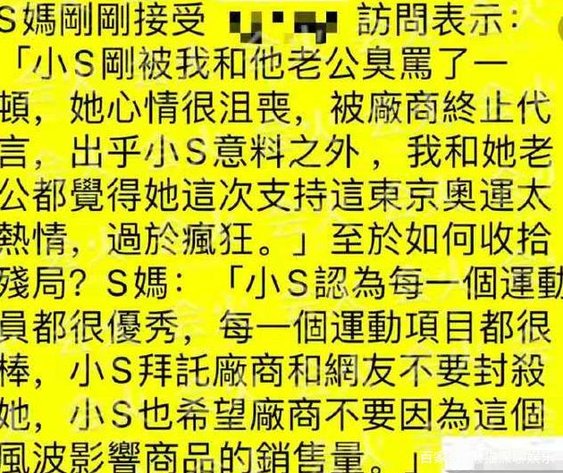 在引起争议之后,小S的妈妈在社交平台当代替自己的女儿进行了回应,表示每一个运动员都非常的优秀,每一个运动项目也都非常的棒,同时小S也希望网友们不要对她进行封杀,也希望品牌不要因为她的这个风波而影响到最终的销量,除此之外,小S的妈妈还表示,在小s发出的一则动态之后,家里人都对她进行了臭骂,因为她对奥运会太过于热情,才会不注意言语才说出了这些话语,当然,从小S妈妈发布的这些回应当中,都可以发现,简直就是求生欲满满了。