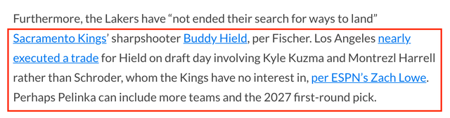 最后需要谈及的是,据《露天看台》记者杰克-费舍尔的说法,即便目前自由球员市场已经开启,但湖人仍在尝试将丹尼斯-施罗德摆上货架并且与国王推动涉及巴迪-希尔德交易的可能性: