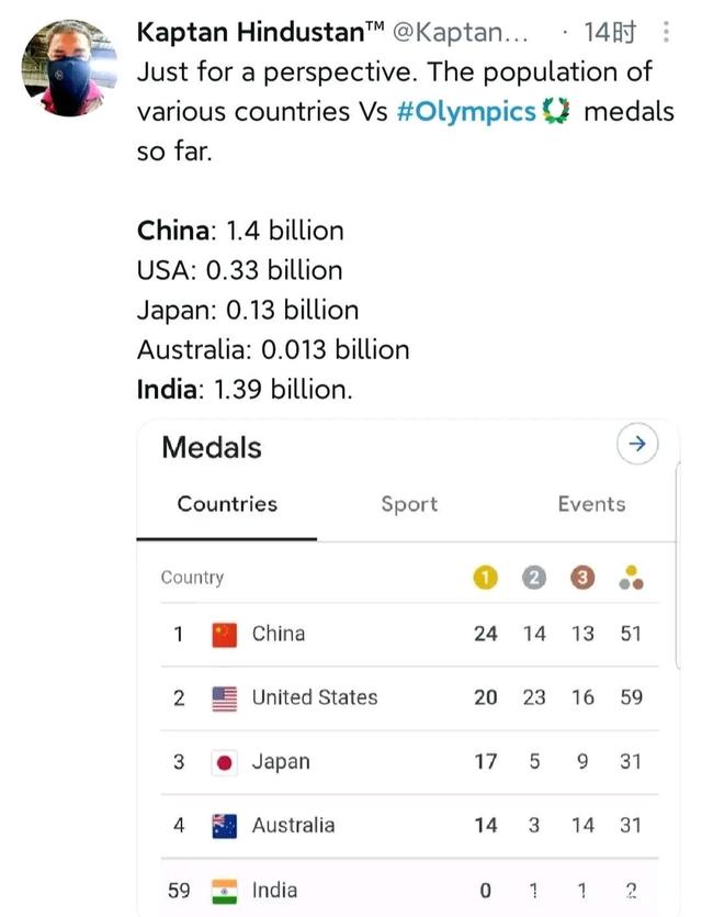截止昨天,东京奥运会金牌数中国力压美国排名第一,东道主日本力压澳大利亚排名第三,而且奖牌总数中国也基本和美国持平了只差了两枚,中国队太棒啦!我一直很好奇世界人口大国印度的表现如何,看了一下印度网友的统计原来只拿了一铜一银,这个和中国根本不是一个级别啊。不是说印度再不努力就要被中国赶超了吗?这句话我怎么听着有点搞笑?