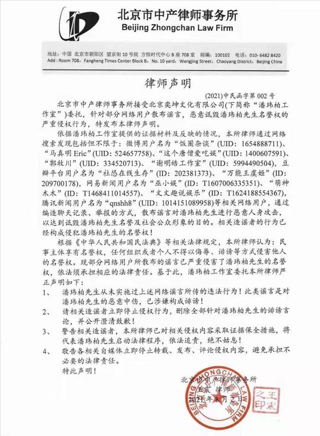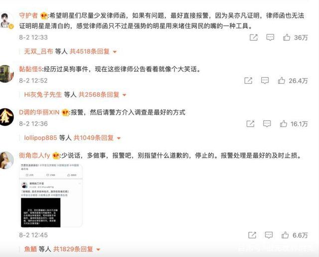 不久之后,潘玮柏的工作室也发布了同样的律师函,但网友们自从经历了吴亦凡事件后,对明星的各种澄清函已经没有了信任度,有网友表示应该叫他们去报警,不是发这些自证清白。