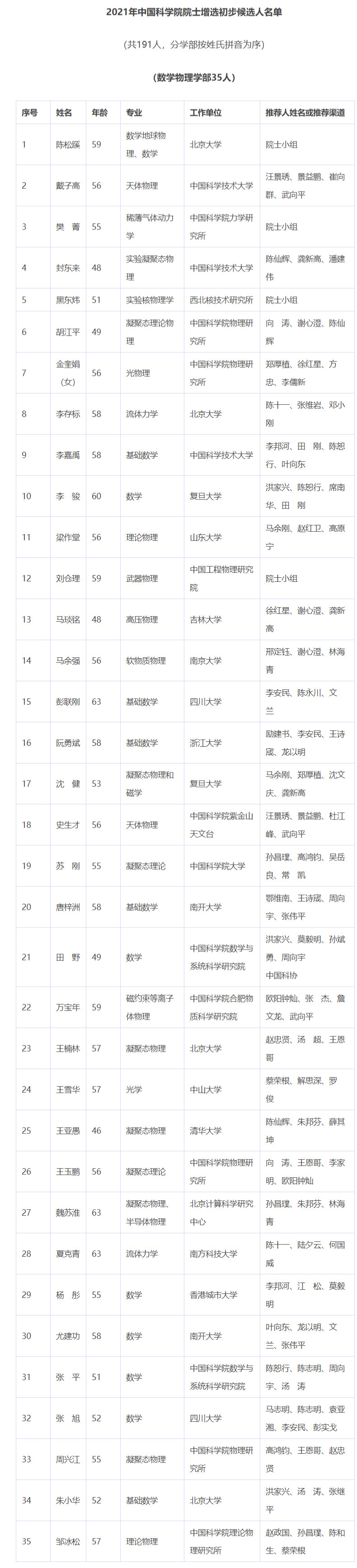昨日(8月1日)中国科学院官网发布《关于公布2021年中国科学院院士增选初步候选人名单的公告》,共191人获得“初步候选”资格。