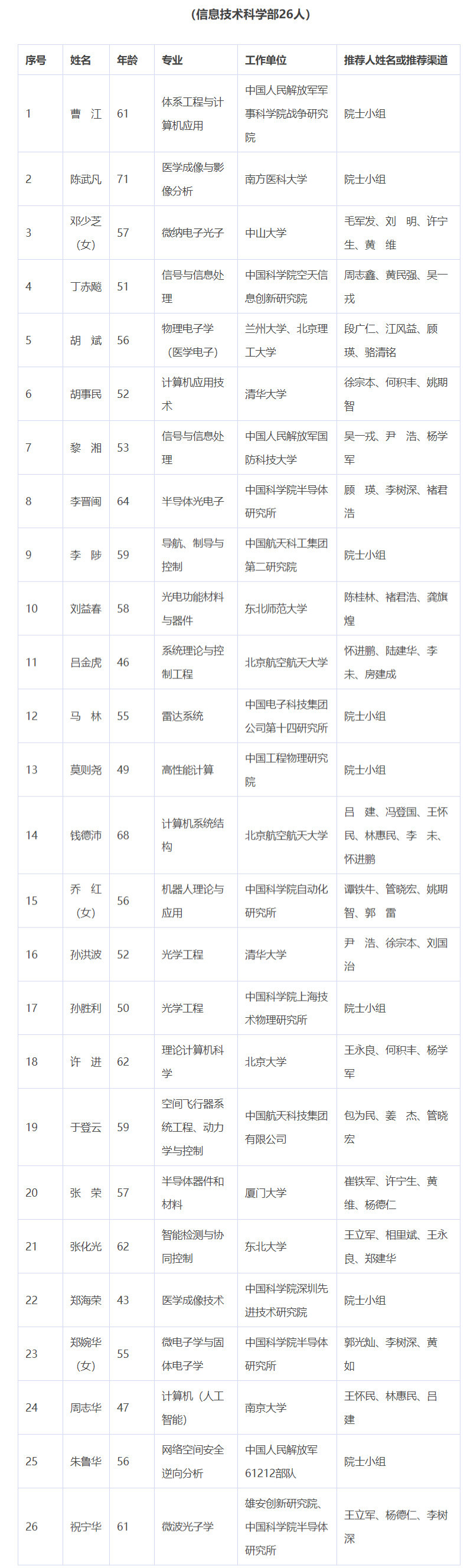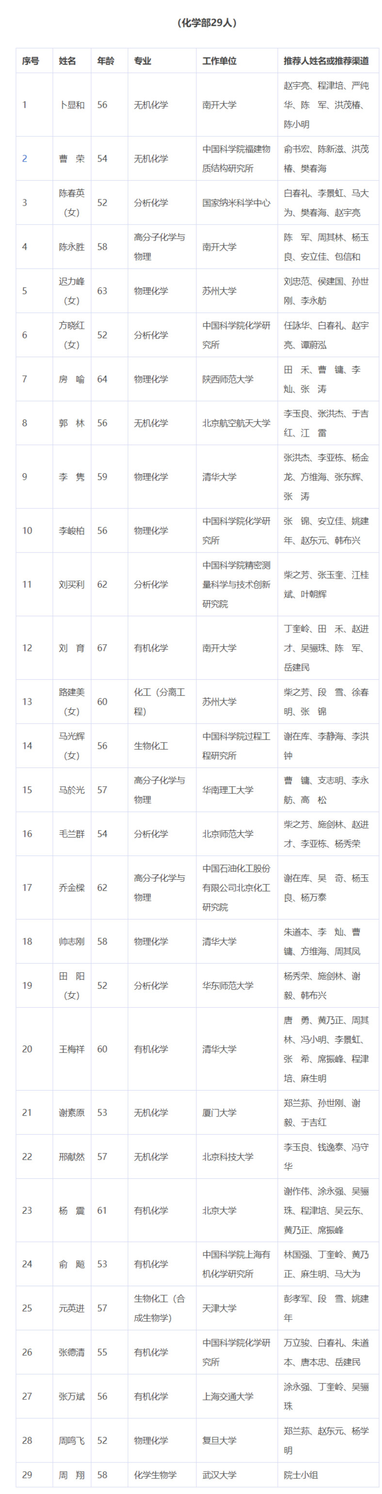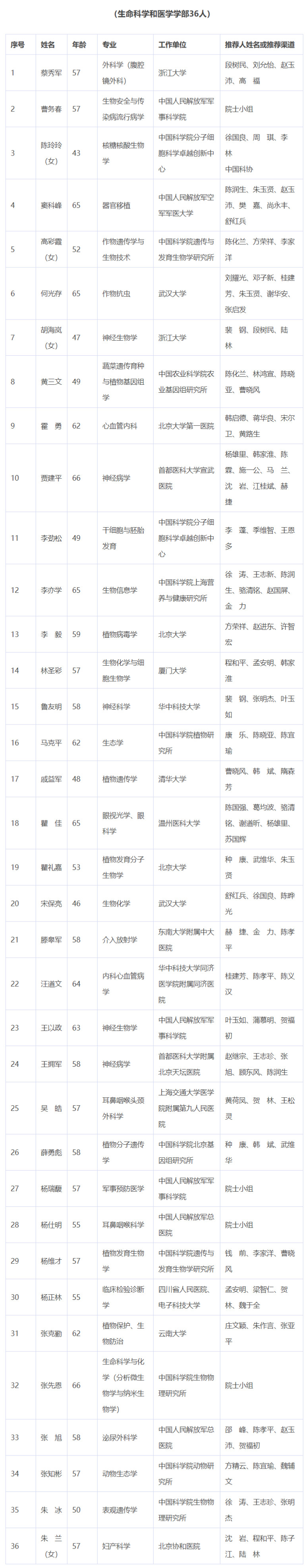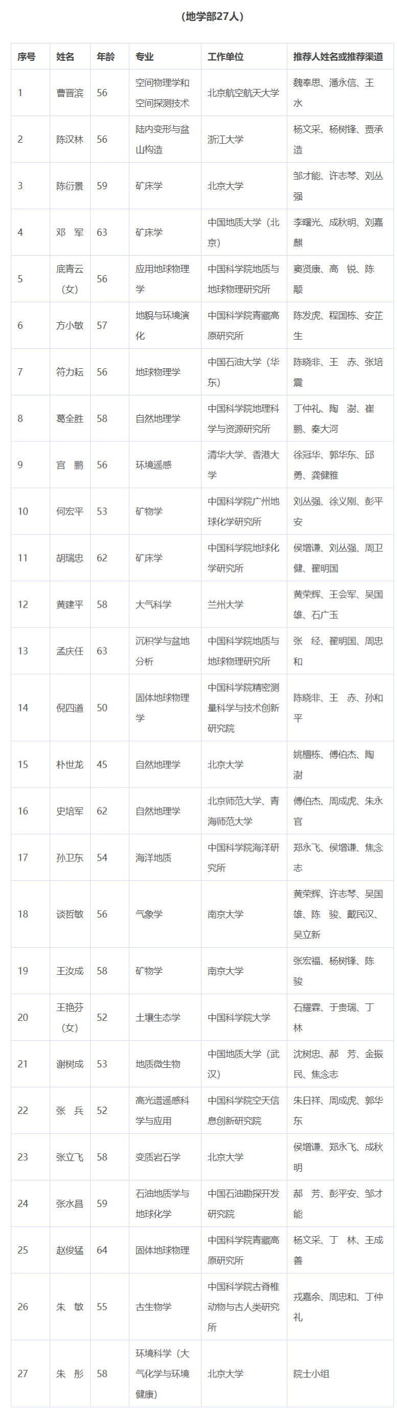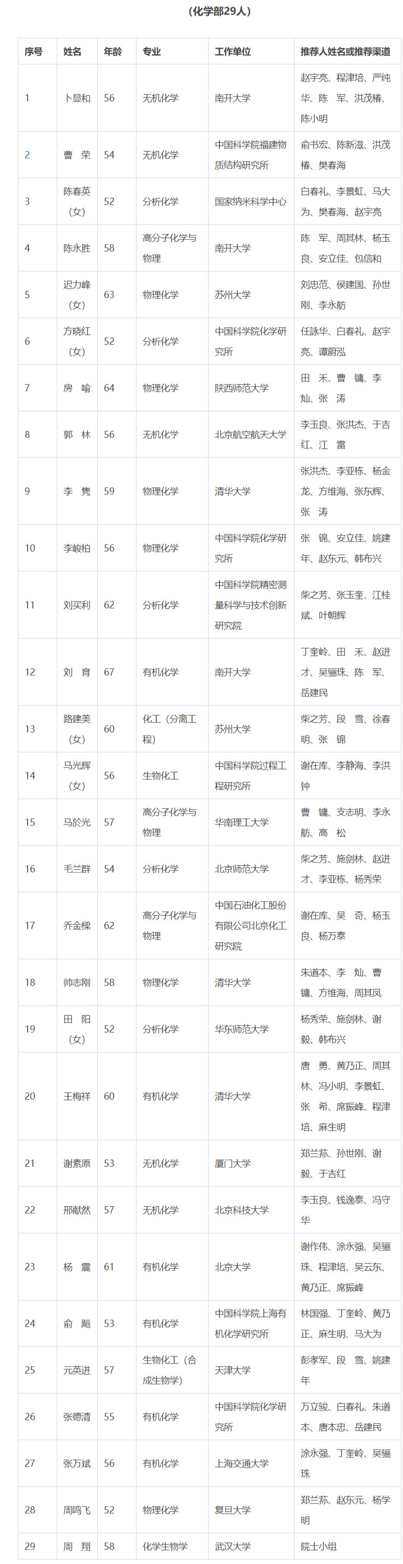以下是候选人的全部名单,资料来自中国科学院官网。