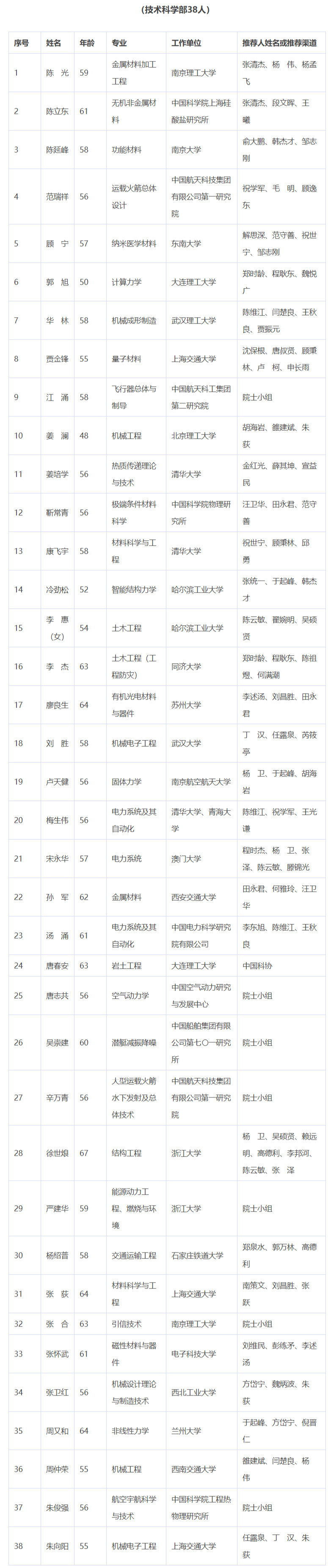 其中,技术科学部38人、信息技术科学部26人、数学物理学部35人、化学部29人、生命科学和医学学部36人、地学部27人。