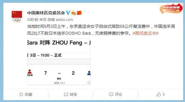 中工网讯 据中国奥林匹克委员会官微消息,当地时间8月3日上午,东京奥运会女子自由式摔跤68公斤复活赛中,中国选手周凤2比7不敌日本选手DOSHO Sara,无缘铜牌赛的争夺。