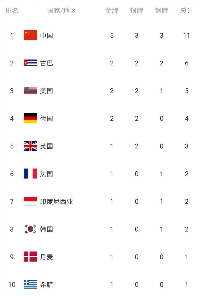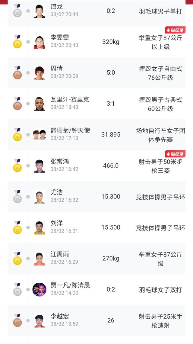 8月2日单日,中国就获得了整整5枚金牌!不仅在金牌榜上排名第一,更在当日新增金牌数量上也排名第一,这两个第一足以说明中国代表团的实力。