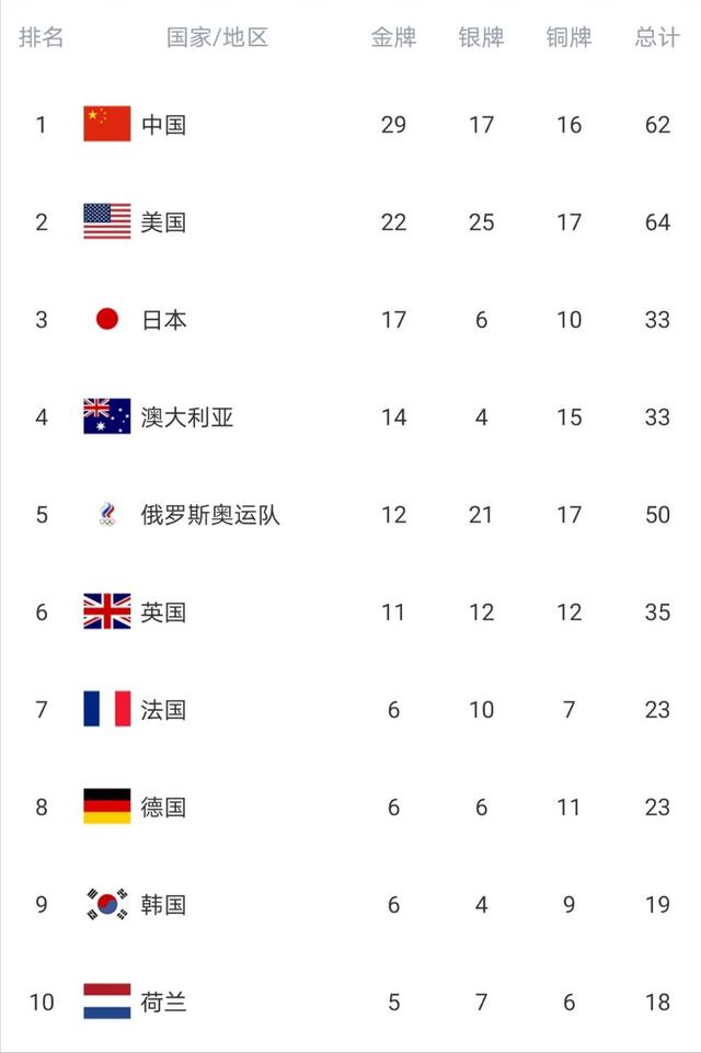 下面我们再来看一看总金牌榜,中国代表团以29枚金牌,17枚银牌,16枚铜牌总计62枚奖牌排名第一。与身后的美国队在金牌数上已经拉开了7枚金牌的差距,这一差距恐怕在接下来的比赛中会越拉越大。