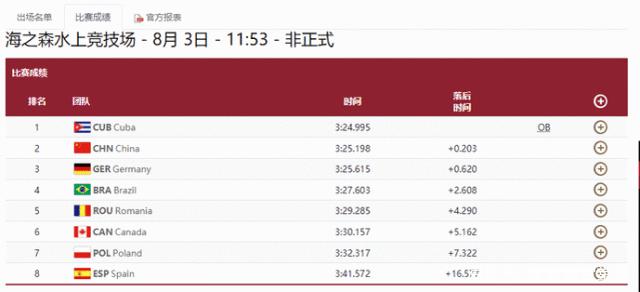 昨天的预赛第一场,中国队在第一组选手中以3分37秒783的成绩完赛,排名小组第一,直接晋级半决赛。今天开始的半决赛争夺,中国的刘浩、郑鹏飞3分27秒023的成绩本组第一挺进A组决赛。
