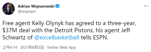 首先是上个赛季在火箭打出身价的奥利尼克,根据Woj报道,活塞已经用一份3年3700万挖走奥利尼克。