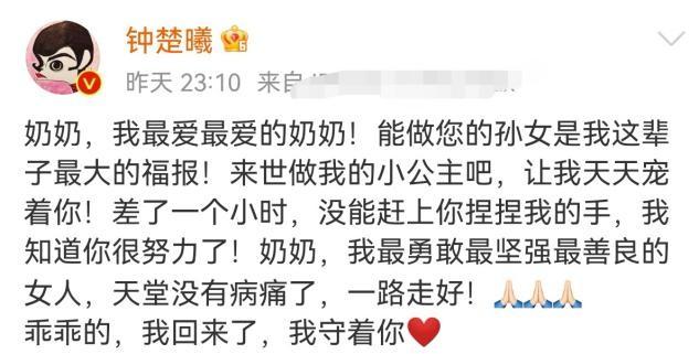钟楚曦表示“我最爱最爱的奶奶,能做您的孙女是我这辈子最大的福报,来世做我的小公主吧,让我天天宠你,天堂没有病痛,一路走好”,她还透露到自己没见奶奶最后一面,晚了一个小时很遗憾。