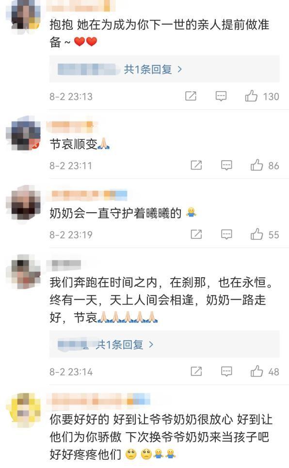 很多网友看到钟楚曦的发文后留言道“节哀顺变,奶奶会永远守护着曦曦的,你要好好的,好到让爷爷奶奶很放心,她在为早日成为你下一个亲人做准备,终有一天,天上人间会相逢”。
