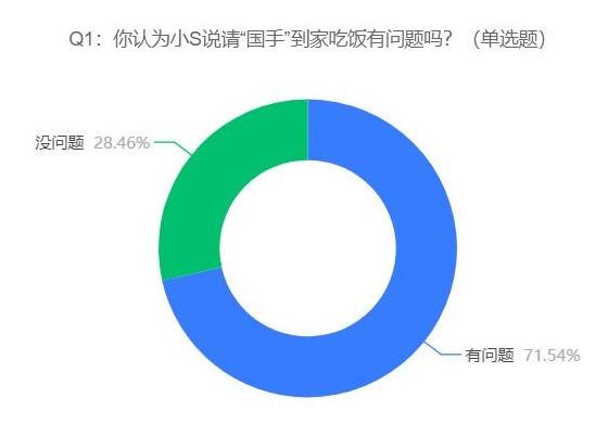 调查显示,71.54%的受访者认为小S说请“国手”到家吃饭有问题,28.46%的受访者认为小S说请“国手”到家吃饭没问题。