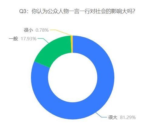 另外,81.29%的受访者认为公众人物一言一行对社会的影响很大,17.93%的受访者认为公众人物一言一行对社会的影响一般,只有0.78%的受访者认为公众人物一言一行对社会的影响很小。