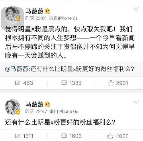 马薇薇随后也发文支持明星X粉,并说没有什么比这个更好的粉丝福利。