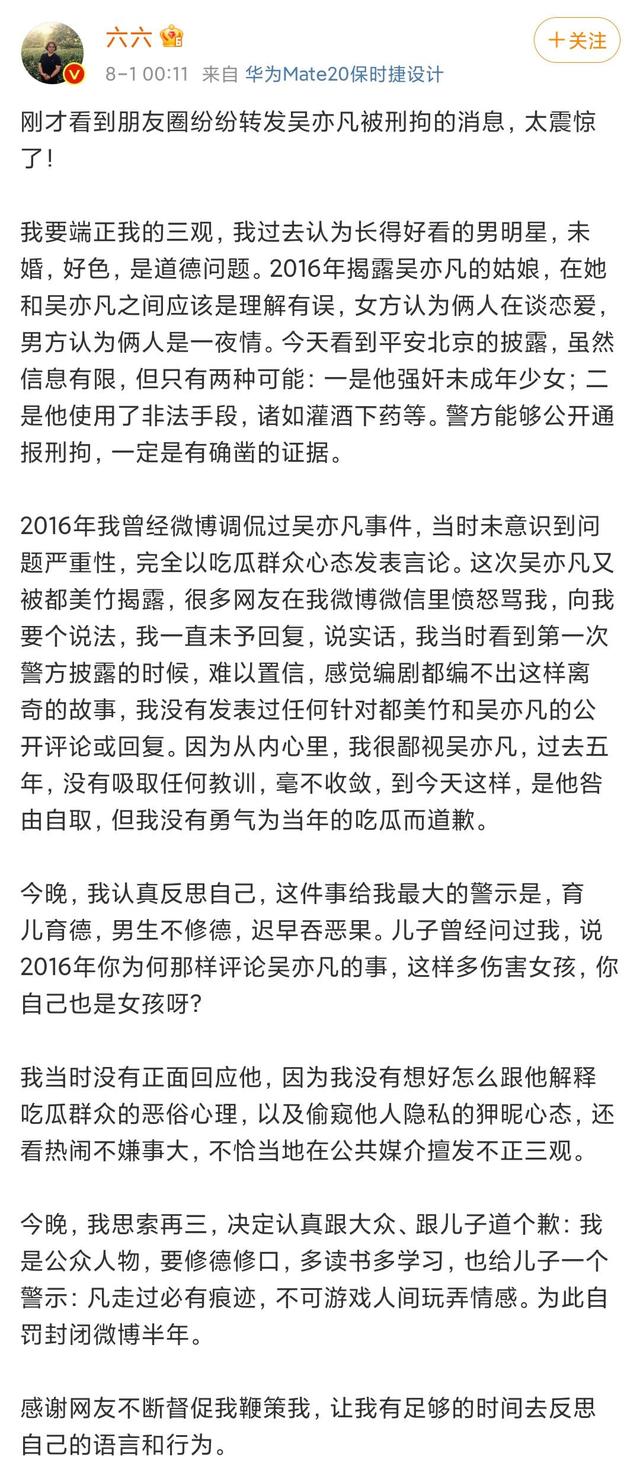 吴亦凡事件后,网友纷纷喊话六六、马薇薇、苏芒出来道歉,在舆论压力面前,编剧六六最先站出来道歉,自罚v博禁言半年: