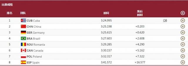 刘浩/郑鹏飞最终的成绩为3分25秒198,古巴组合以3分24秒995夺金!