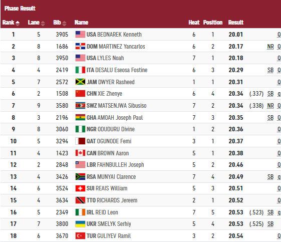 男子100米项目结束之后,接下来田径项目聚焦男子200米,中国仅有谢震业参赛,在该项目最好成绩是19秒88,成为第一位跑进20秒以内的黄种人。