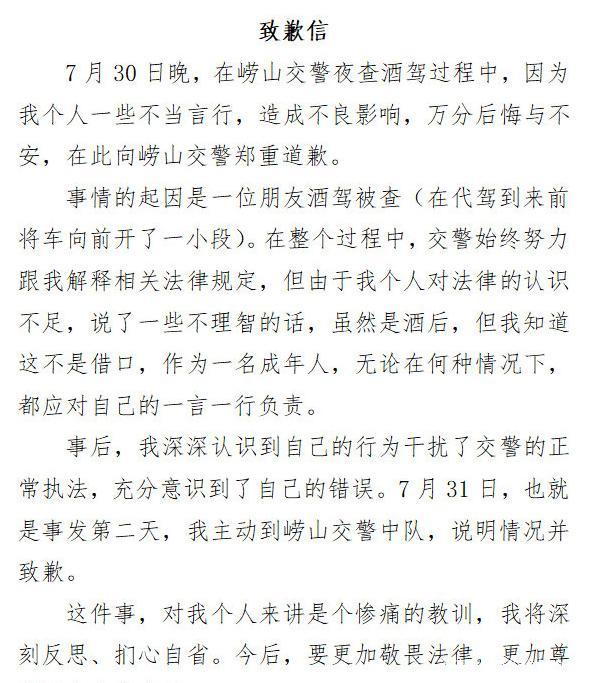 这件事的起因是一位朋友喝酒时被查到,因为自己对法律了解不够,酒后说了些不合理的话。之后,自己才完全明白自己的错误。七月三十一日,主动到交警中队报案并道歉。