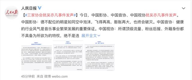 三个协会为吴亦凡事件发声,大意是谴责吴亦凡不配位,严重破坏行业风气,造成恶劣影响。三巨头同时出声,几乎相当于给吴亦凡的“棺材板”钉上最后一颗钉子。