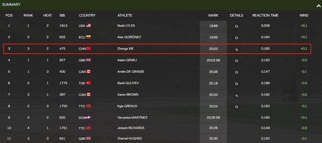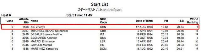 而在半决赛能排名第三的谢震业受到了道次的影响,最终只跑出20秒14的成绩夺得第7名。