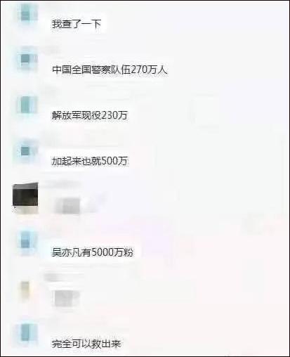 脑残重症粉丝群中有人说“吴亦凡有5000万粉丝,解放军和警察队伍加起来也就500万,完全可以救出来”的。