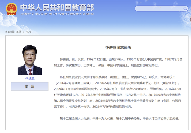8月2日,教育部官网“教育部领导”栏目显示,怀进鹏已任教育部党组书记。