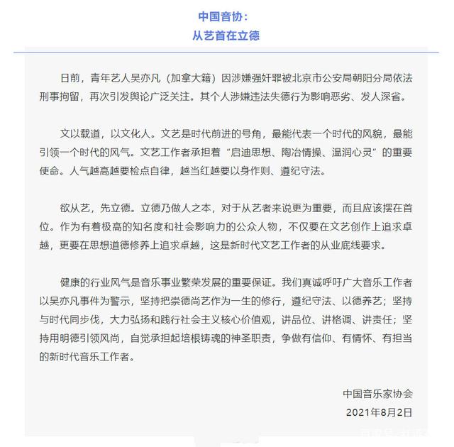 由于吴亦凡是以音乐人的身份出道并发展至今,所以他在音乐方面的影响力要远超影视,其人气流量大多也来源于此,而且国内的明星艺人从艺也大多是从音乐方面开始或有所涉及,所以中国音协在娱乐圈的影响力更广。中国音协的此次发声并未涉及艺人们的法律意识内容,只是单纯希望艺人加强对自己的德行建设,毕竟德行乃艺人从业之基石。