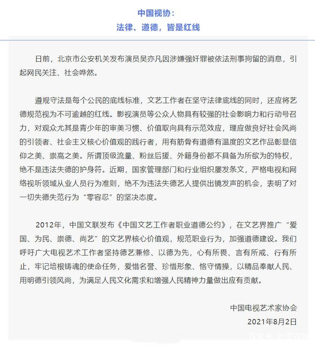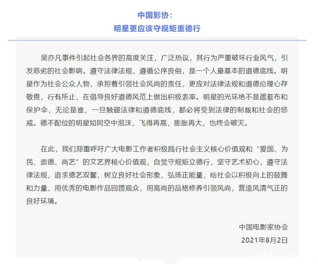 中国影协是影视圈资格最老的人民团体,历经七十多年的发展,早就成为电影界的标杆和行业发展引导者。此次罕见针对明星艺人发声,可见吴亦凡事件对影视圈和社会大众造成了严重的影响,所以中国影协有必要站出来规范并加强明星艺人的法规观念和德行修养。