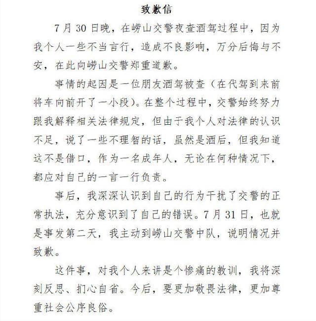 所以第二天也就是7月31日,男子向崂山交警道歉,还写下了“致歉信”。