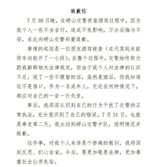这段视频在网上疯传后,8月1日晚,该赵在微博发帖称:7月30日晚,在崂山交警夜查酒驾过程中,因为我个人一些不当言行,造成不良影响,万分后悔与不安,在此向崂山交警郑重道歉。并附一张致歉信图片。