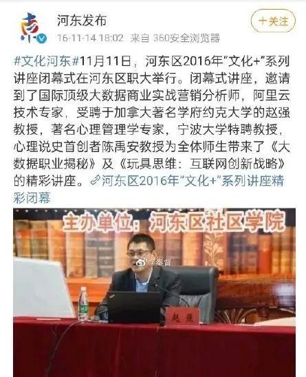 8月1日,新浪微博上认证身份为数据营销实战专家,加拿大约克大学商学院特聘教授的@赵强xj 发文道歉。另有网友比对发现了一张此人在某野鸡大学演讲的图片。
