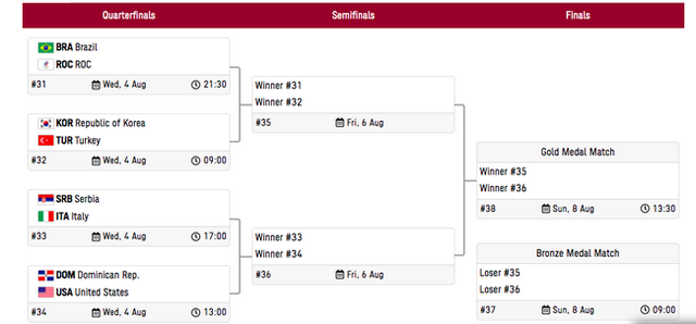 此外,伴随着小组赛的结束,女排八强对阵也随之出炉。在上半区,巴西将对阵俄罗斯奥委会,韩国将迎战土耳其;下半区中,塞尔维亚将迎战意大利,多米尼加则战美国女排。其中,四分之一决赛的首场比赛,将在8月4日进行。