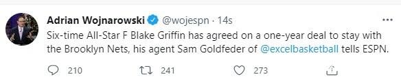 据名记Woj报道,格里芬同意以一年合同留守篮网。格里芬在20-21赛季与活塞完成买断,然后选择加盟到篮网,出战26场常规赛,场均贡献10.0分4.7篮板2.4助攻,还多次上演扣篮。球队总经理马克斯此前就表示球队的计划是把格里芬带回布鲁克林,如今他们也的确做到了。