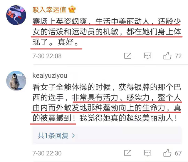 有一位网友说:“奥运会的意义在于让我这种懒宅也能欣赏到运动的美,甚至还想要运动一小下。”