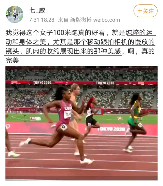 “运动员真美啊……他们在自己努力到达的比赛场上燃烧着生命,为了信念拼尽一切的模样便是人类最美的姿态之一了吧……不论是为了超越极限而‘面露狰狞’,还是在克服痛苦时的咬牙切齿,都是那么美丽,灿烂而炙热。”(@玖酒Rintsuki)