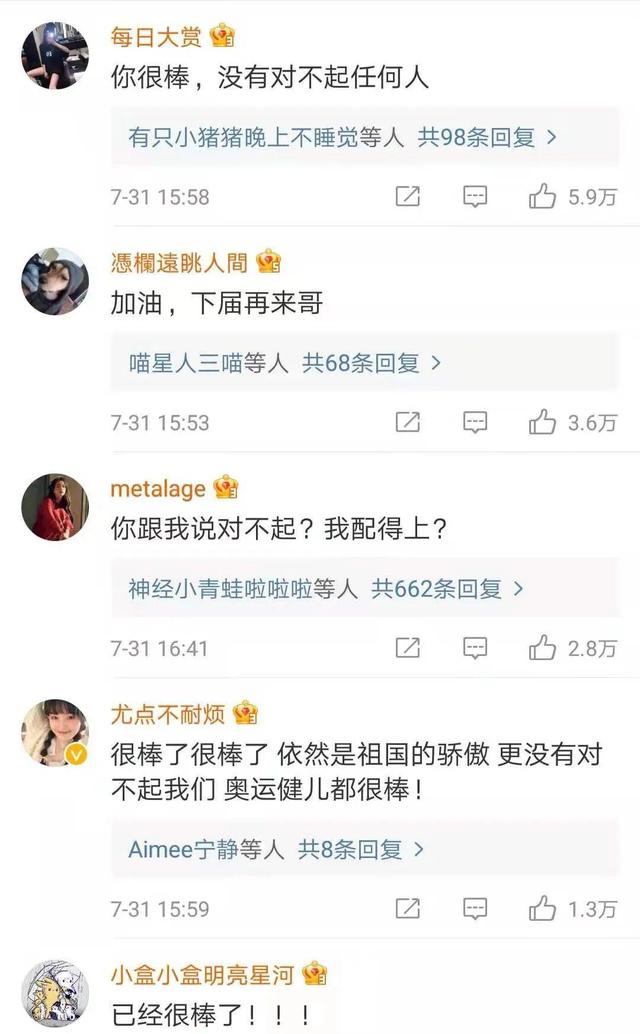 无论是哭着说“对不起大家”的刘诗雯,还是发博说“对不起祖国人民”的李佳伦,都得到了网友温暖的回应。真好,输赢之外,还有一种美:是理解包容的美好,是专注过程的美妙,是“你仍是我们的骄傲”的美意。