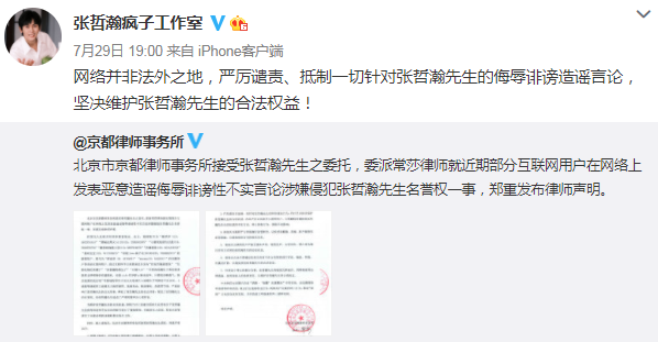 不过,这并没有阻止网友们吃瓜的热情。这不,眼看张哲瀚“有嫂子”的瓜在网络平台上越传越凶,他的经纪公司终于坐不住了,并于7月29日在其工作室的社交账号上进行辟谣,还以律师声明的形式表达对网络上的相关言论进行警告。