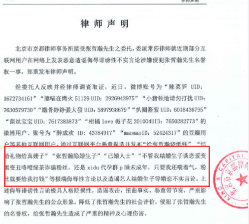 不过,仔细阅读张哲瀚的工作室所发的律师声明,可以看出其工作室只是对网络上有关其“已婚、隐婚生子”等婚恋传闻进行辟谣,而并没有明确否认关于“张哲瀚进行恋爱,有女友”的八卦传言。